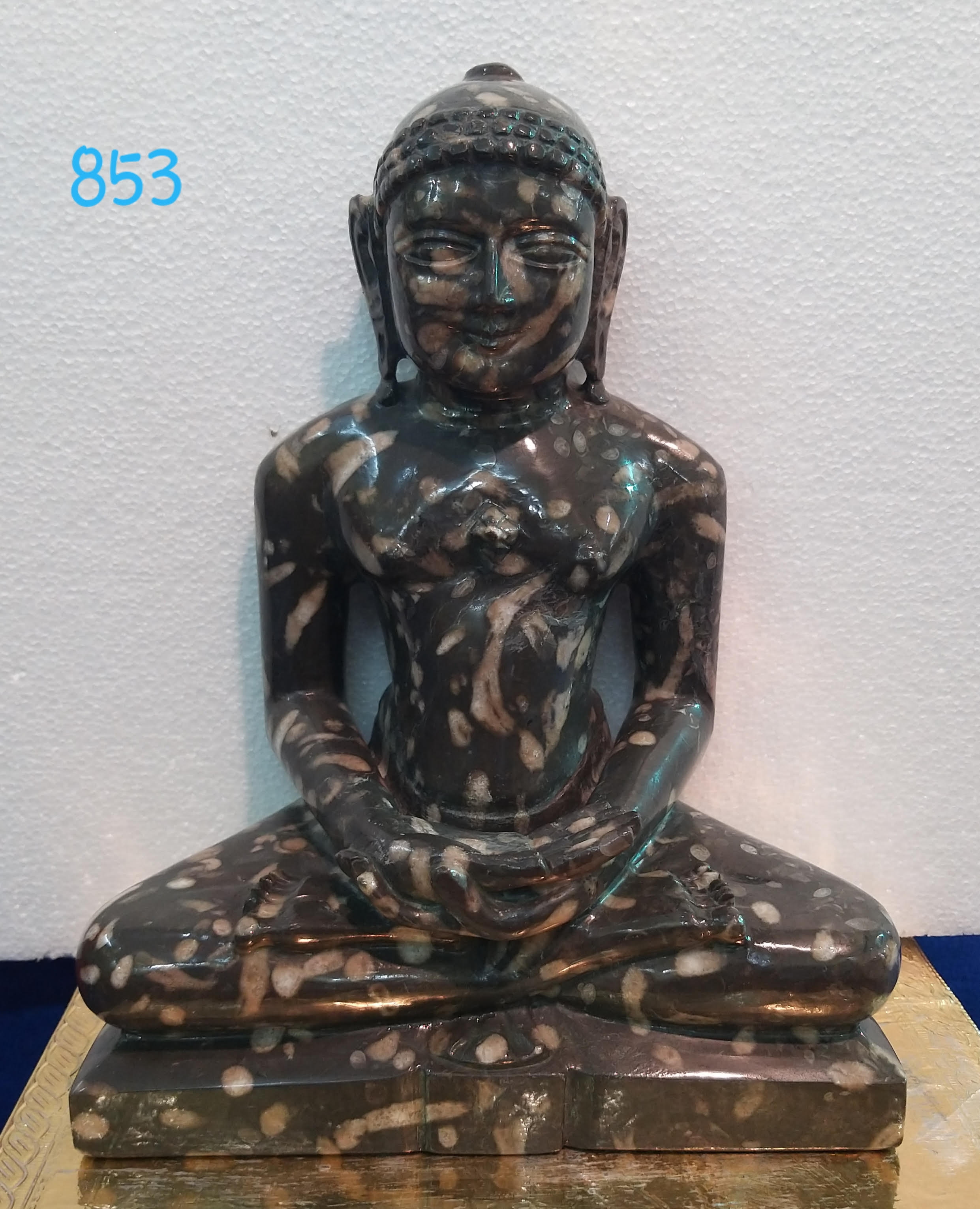 A harmonious mixture of the colors white and brown, giving this statue a bold look. Calm and poised expressions exhibit a divine aura of the idol. The padmasan posture is well depicted and carries the weight of the idol well in place.