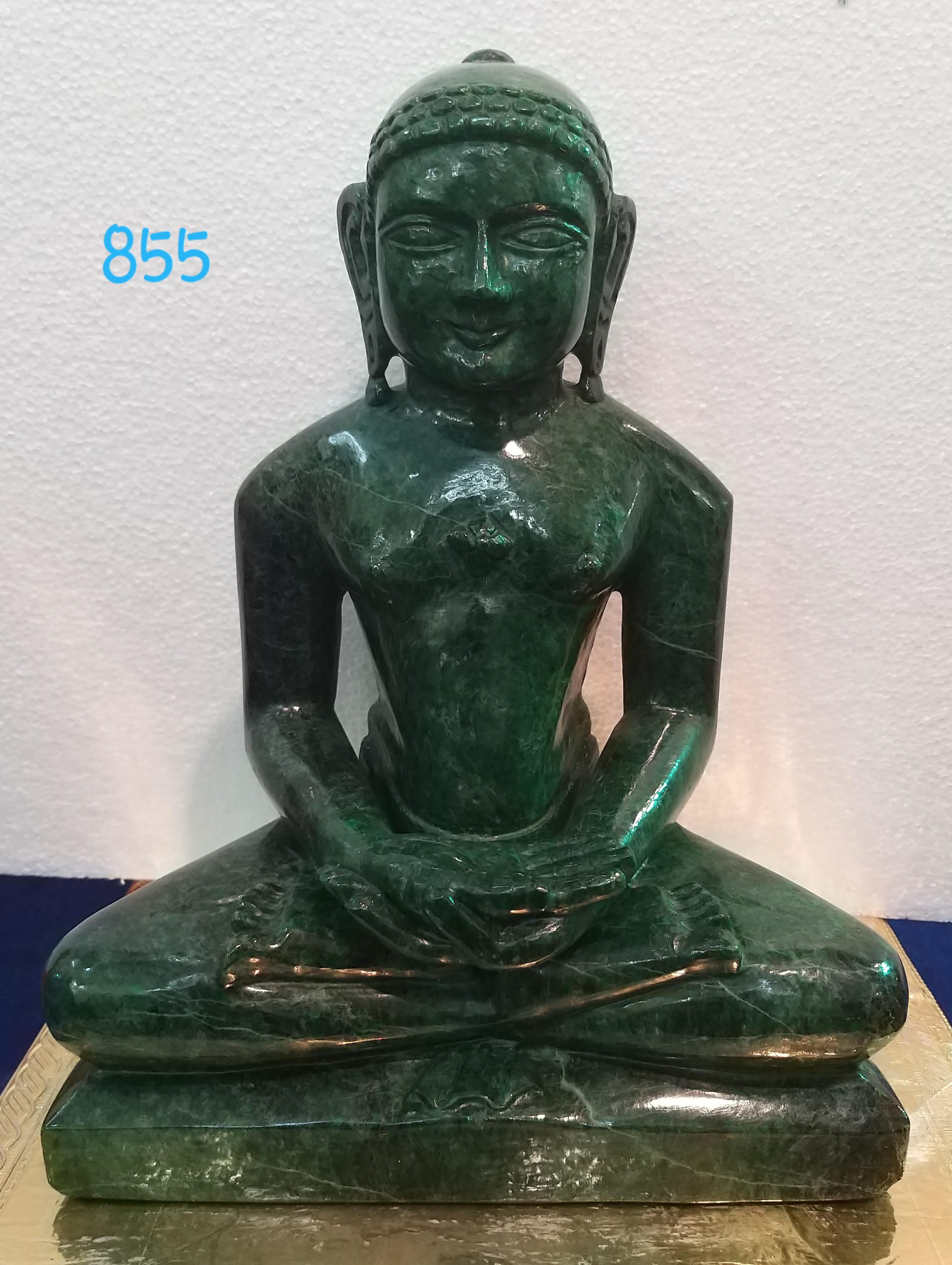 Harmoniously displayed statute of Tirthankara with deep dark shade of green giving it a vibrant look and beautifully crafted idol in well displayed "padmasana" position. It is fine masterpiece indeed. Maw sit sit has meaning and properties of getting back vitality and energy. It is a gemstone that can vitalize weaken mind.