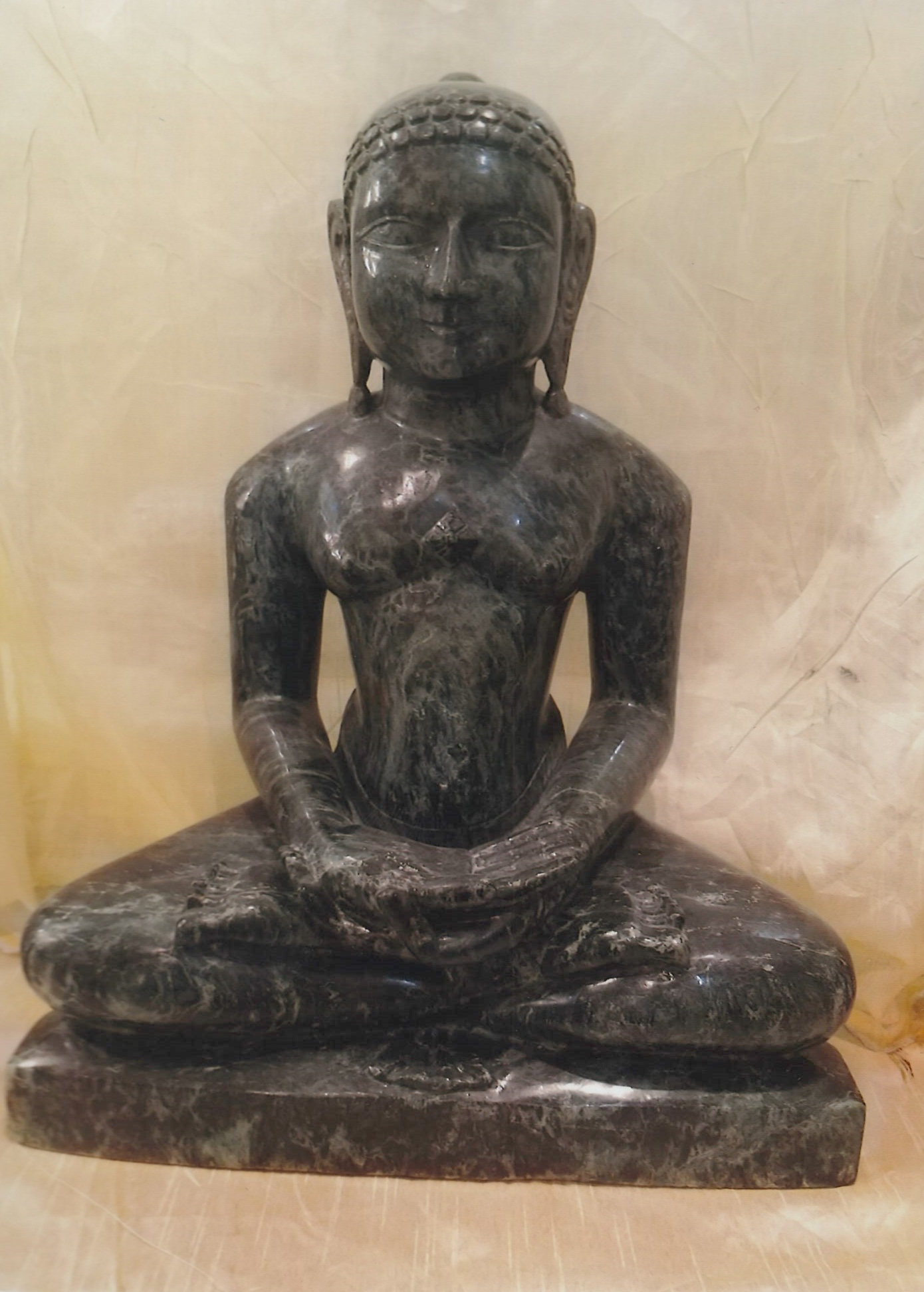 Green of the sea forms this beautifully crafted "Tirthankar" in fuchsite. The eyes and lips are highlighted lightly with color together with the accent of the Tilak. A divine piece of art indeed. Fuchsite helps to overcome codependency and aids in a speedy recovery from trauma, both emotionally and physically. Fuchsite increases the energy of other crystals and helps in the transfer of their energy.