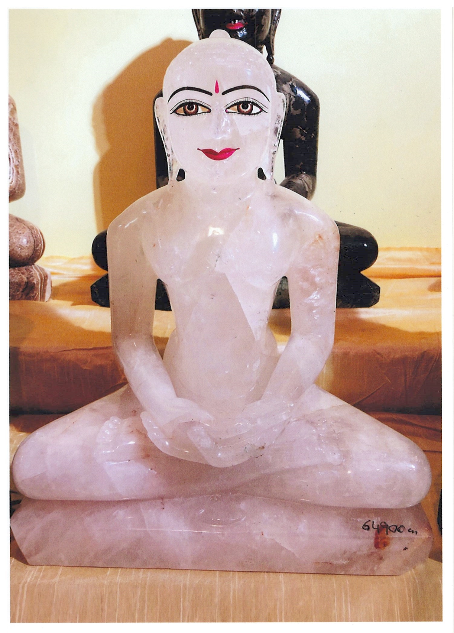 An exceptionally beautiful statue of "Thirthankara" with light coloured textured. Beautifully crafted Tirthankar in Aquamarine. The eyes and lips are highlighted lightly with color together with the accent of the Tilak. A divine piece of art indeed. Clear Quartz enhances psychic abilities. It aids concentration and unlocks memory. Stimulates the immune system and brings the body into balance.